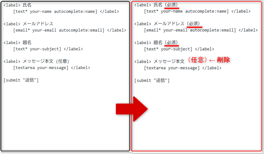 ここでは【氏名】の横に(必須)を追加して、【メッセージ本文】の(任意)を削除してみました。