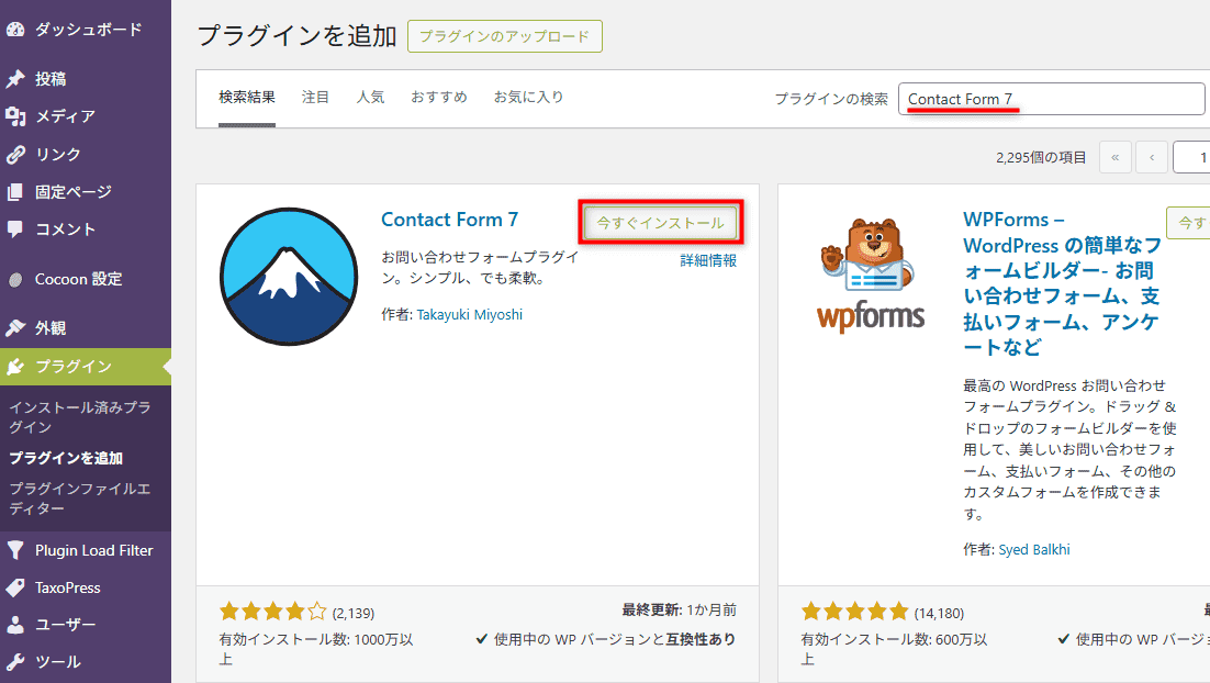 プラグインの検索窓に Contact Form 7 と入力し →「今すぐインストール」