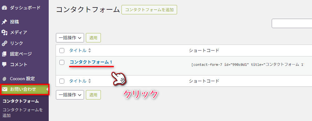 「コンタクトフォーム1」をクリックし、コンタクトフォームの編集画面を開きます。