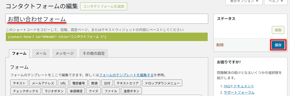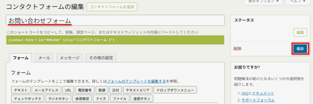 タイトルを「お問い合わせフォーム」などに変更し、ステータスから保存をクリック