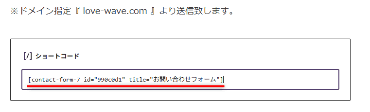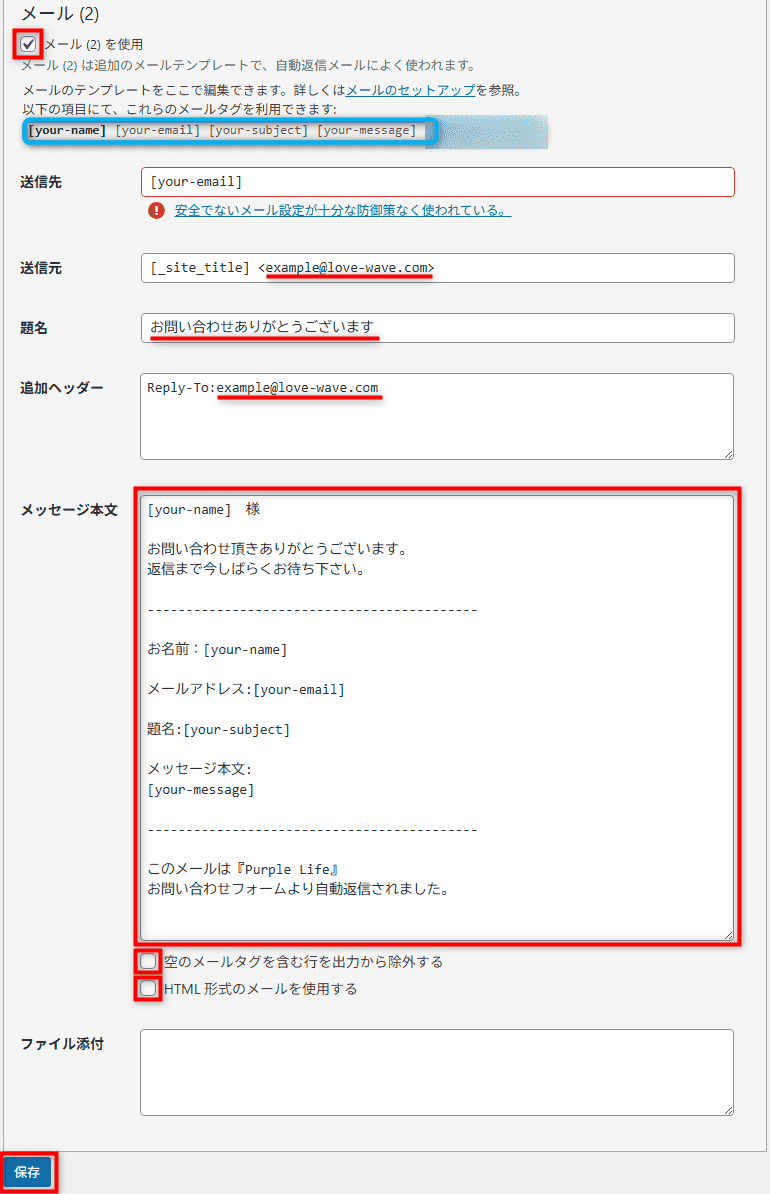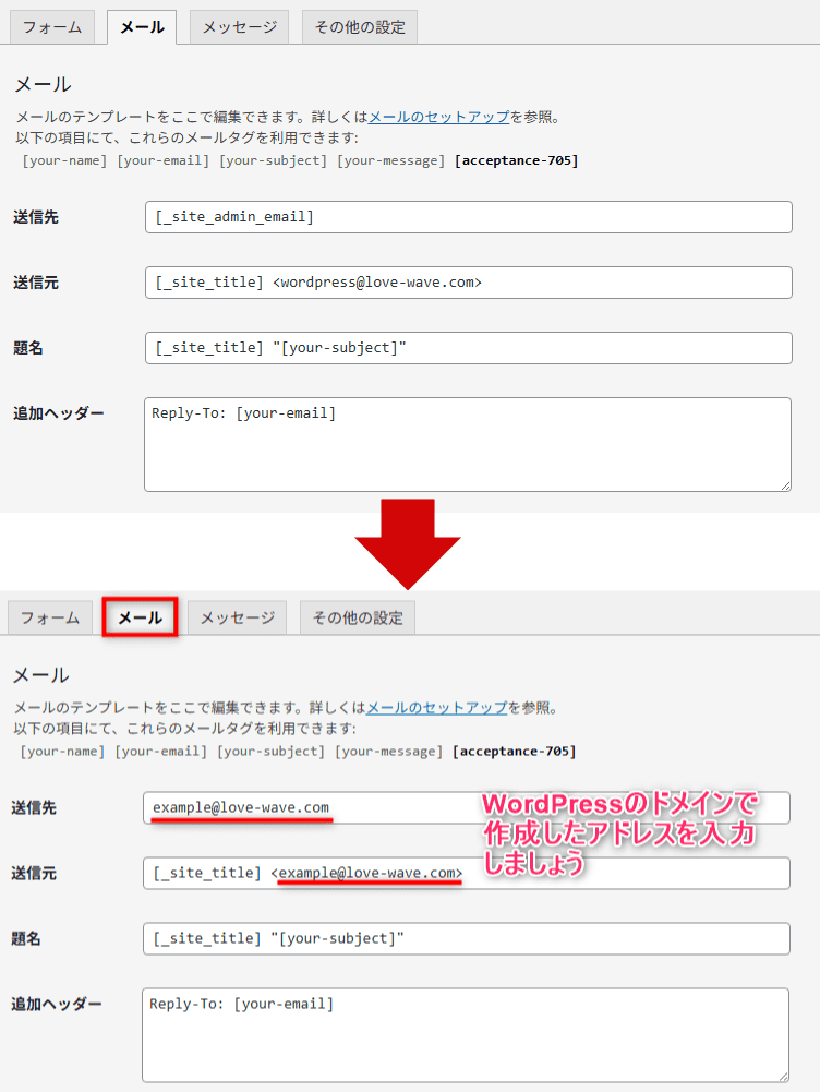 そこで【送信先】と【送信元】の両方を、サイトのドメインで作成した同じメールアドレス(例 : example@love-wave.com)に設定したところ、動作が安定しました。