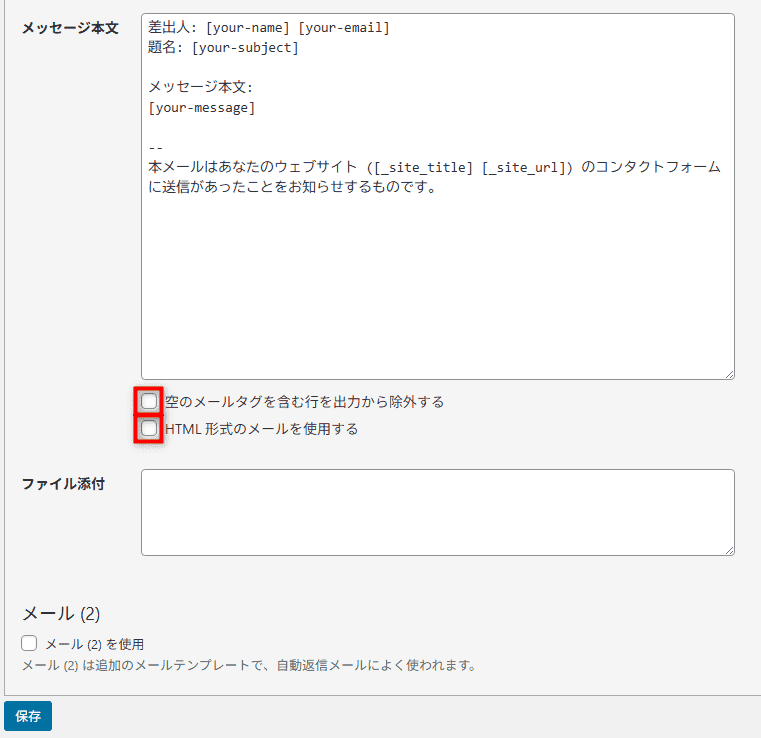 次は、「空のメールタグを含む行を出力から除外する」と「HTML形式のメールを使用する」の設定。