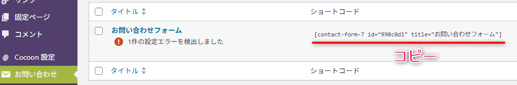 ②作成したフォームの右横に表示されている [ショートコード] をコピーし、再びダッシュボード → 固定ページ → 「お問い合わせ」を開きます。