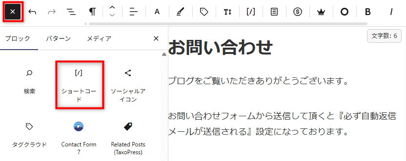 ④左上の + 「ブロックインサーター」 → 「ショートコード」アイコンをクリック