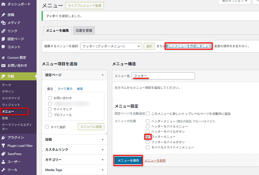 フッターメニューが表示されていない場合は、新しくフッターメニューを作成しましょう。