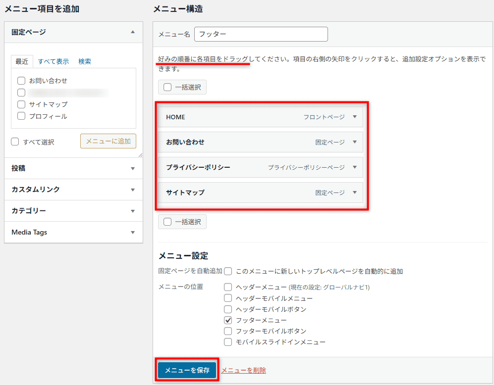 ④メニュー構造内に追加した項目を、お好みの順番になるようドラッグして入れ替えたら、メニューを保存します。