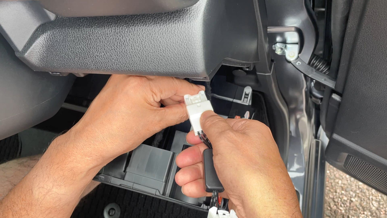 ⑥外したコネクターの間に「アイドリングストップキャンセラー」を、割り込み接続し、カチッと差し込んで取り付ける
